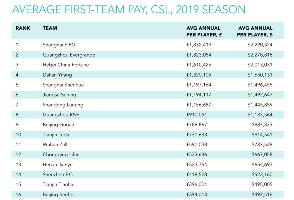 图为“体育情报”网站公布的2019赛季中超俱乐部平均薪资