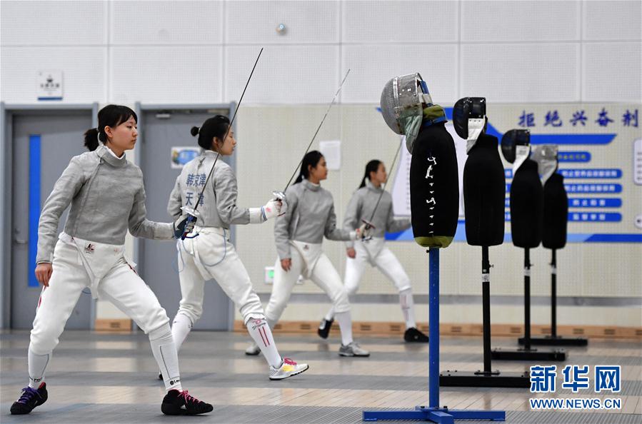 4月7日,天津击剑队女子佩剑组运动员在训练中。 近日,随着国内新冠肺炎疫情防控形势向好,天津市体育局组织各运动队教练员、运动员在训练基地进行封闭训练,陆续恢复训练备战工作。 新华社记者李然摄