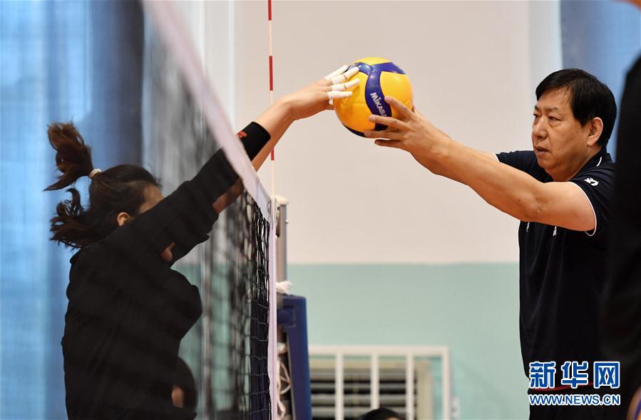 4月7日,天津女排主教练王宝泉(右)在训练中指导球员。 近日,随着国内新冠肺炎疫情防控形势向好,天津市体育局组织各运动队教练员、运动员在训练基地进行封闭训练,陆续恢复训练备战工作。 新华社记者李然摄