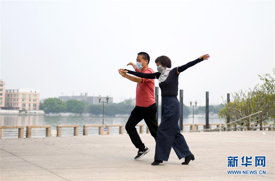 4月8日,两名市民在珠江边的广场上跳舞。 随着疫情防控形势持续向好,广州市民纷纷走出家门,以各种方式锻炼身体,愉悦心情。 新华社记者卢汉欣摄
