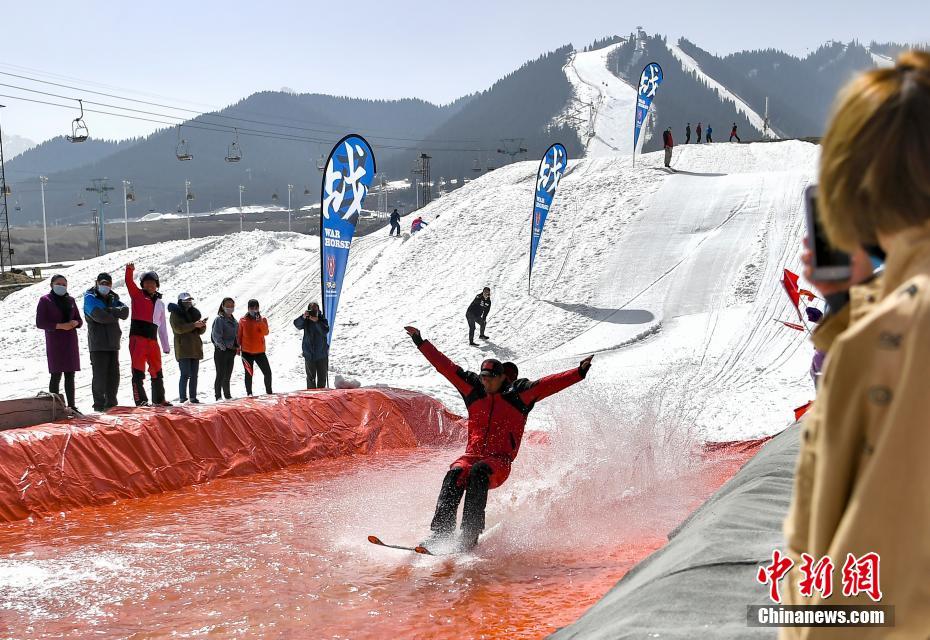 4月11日,新疆维吾尔自治区乌鲁木齐市丝绸之路国际滑雪场举办“乐享冰雪·心宿南山”告别雪季主题活动,吸引众多滑雪爱好者参与其中。随着气温升高,乌鲁木齐市周边山区积雪逐步融化,为了确保滑雪体验和人身安全,该市周边滑雪场陆续停业。图为滑雪爱好者参与滑水大赛。中新社记者 刘新 摄