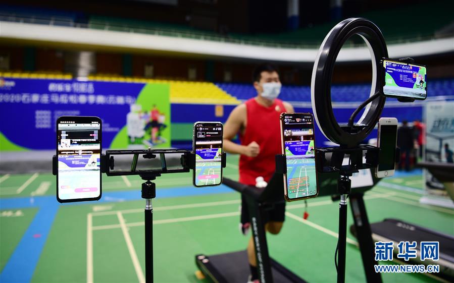 4月12日,在河北体育馆开幕式现场,健身教练通过直播设备线上带领网上参赛选手进行赛前热身。 当日,2020石家庄马拉松春季赛(云端马)线上开幕式在河北体育馆举行。此次赛事于4月3日开启报名,持续到4月19日结束。疫情期间,比赛采用线上方式进行,参赛者使用任意可记录跑步数据的应用程序(APP)完成比赛,并上传成绩截图。 新华社发(张晓峰 摄)