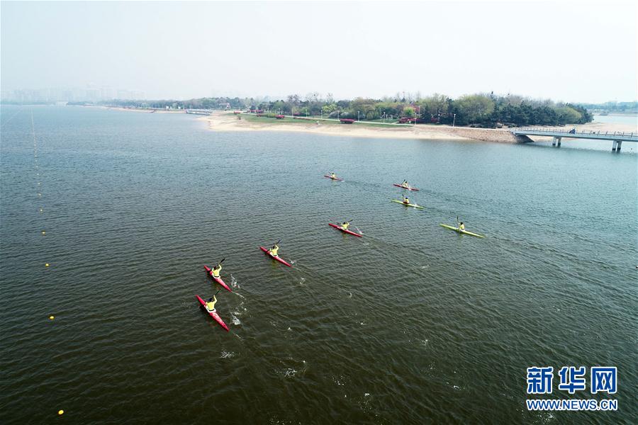 4月15日,中国皮划艇队队员进行训练(无人机照片)。 中国赛艇队、皮划艇队已于近日转场至山东日照水上训练基地,未来一段时间将在此备战延期举行的东京奥运会。 新华社记者 王凯 摄