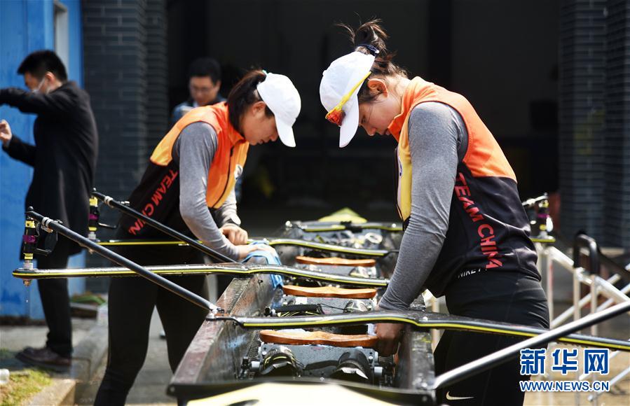 4月15日,中国赛艇队队员巨蕊(右一)在训练前调试设备。 中国赛艇队、皮划艇队已于近日转场至山东日照水上训练基地,未来一段时间将在此备战延期举行的东京奥运会。 新华社记者 王凯 摄