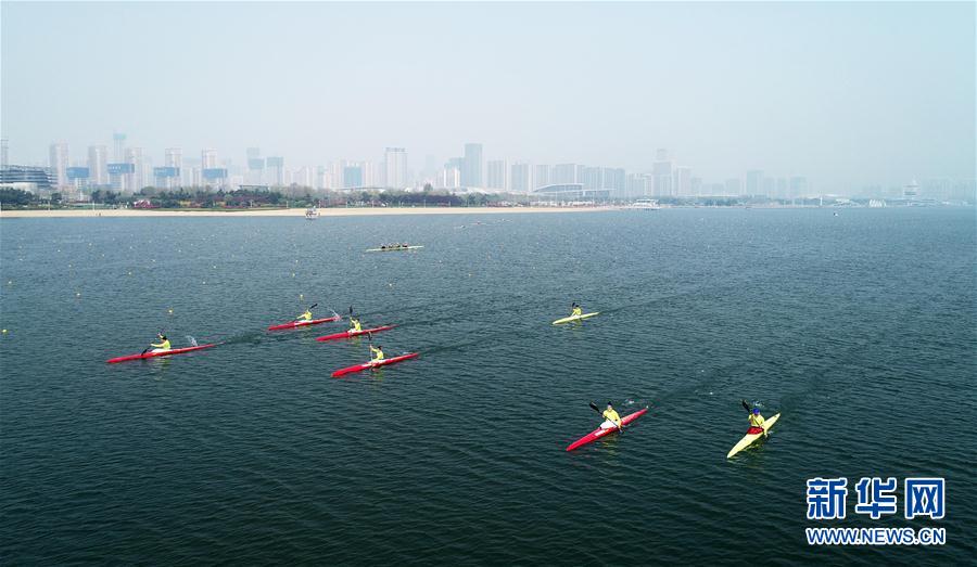 4月15日,中国赛艇队、皮划艇队进行训练(无人机照片)。 中国赛艇队、皮划艇队已于近日转场至山东日照水上训练基地,未来一段时间将在此备战延期举行的东京奥运会。 新华社记者 王凯 摄
