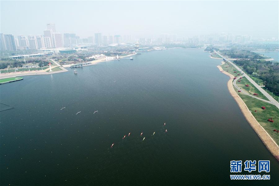 4月15日,中国赛艇队、皮划艇队进行训练(无人机照片)。 中国赛艇队、皮划艇队已于近日转场至山东日照水上训练基地,未来一段时间将在此备战延期举行的东京奥运会。 新华社记者 王凯 摄