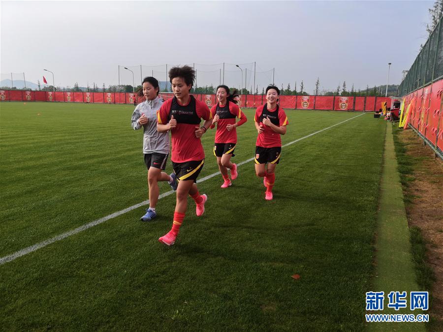 4月16日,王霜(左二)、吕悦云(右一)、姚伟(右二)在训练中。 当日,王霜、吕悦云、姚伟三名中国女足武汉籍球员结束隔离观察,与正在苏州集训的国家女足开始合练。中国女足国家队4月初在苏州集中开始为期四周的集训。 新华社发(中国女足国家队供图)