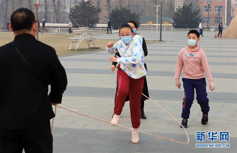 在长春市文化广场,孩子们跳绳锻炼(2020年4月14日摄)。 近日,长春市天气渐暖,市民在做好个人防护的前提下,来到户外健身锻炼,享受春光。 新华社记者雒圆摄