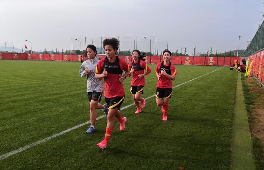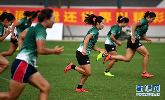 4月17日,中国女子七人制橄榄球队球员高月影(右一)与队友一起进行体能训练。 首次获得奥运会参赛资格的中国女子七人制橄榄球队正在海口观澜湖足球训练基地集训,备战延期举行的东京奥运会。据了解,球队接下来要在海口进行三周以上的集训。 新华社记者郭程摄