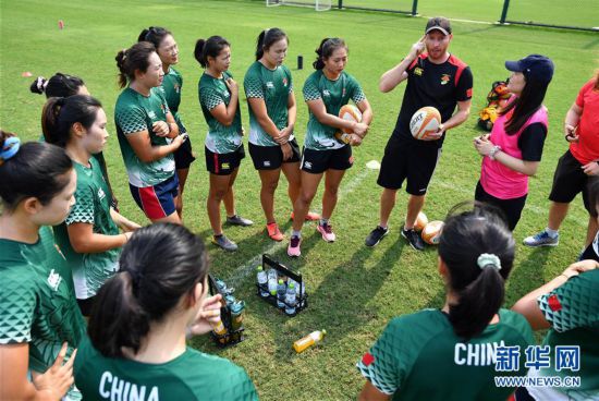 4月17日,中国女子七人制橄榄球队外籍技术教练尤安·麦金托什(后排右二)指导球员训练。 首次获得奥运会参赛资格的中国女子七人制橄榄球队正在海口观澜湖足球训练基地集训,备战延期举行的东京奥运会。据了解,球队接下来要在海口进行三周以上的集训。 新华社记者郭程摄