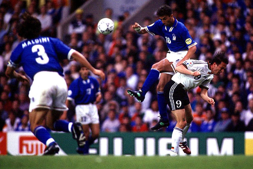 央视网消息:德国队在世界杯和欧洲杯上的最大“苦主”是意大利,“德意志战车”每次遇到意大利,就仿佛撞上了一道“混凝土墙”,难以翻越。1996年欧洲杯小组赛,意大利0-0德国。