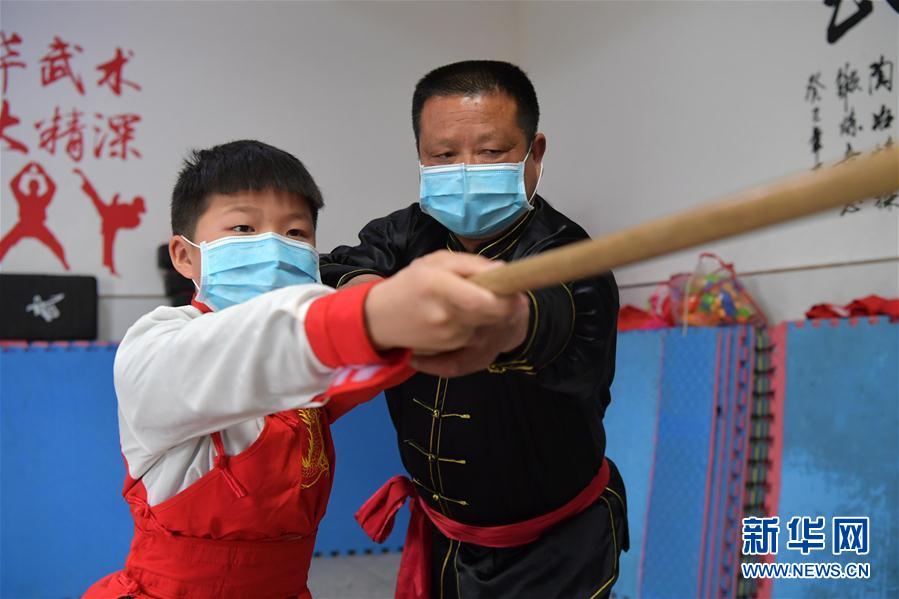 4月21日,袁建林(右)正在指导孩子练习武术。 目前,受新冠肺炎疫情影响,江西省宜春市各中小学校还未全面开学,不少孩子仍居家学习。在宜春市袁州区南庙镇,南庙武术的传承人袁建林利用业余时间,为村里的孩子免费教授传统武术,让孩子们在学习之余锻炼身体,强健体魄。 新华社记者 彭昭之 摄