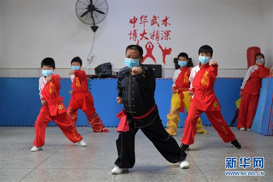 4月21日,袁建林(中)正在带领孩子们练习南庙武术。 目前,受新冠肺炎疫情影响,江西省宜春市各中小学校还未全面开学,不少孩子仍居家学习。在宜春市袁州区南庙镇,南庙武术的传承人袁建林利用业余时间,为村里的孩子免费教授传统武术,让孩子们在学习之余锻炼身体,强健体魄。 新华社记者 彭昭之 摄
