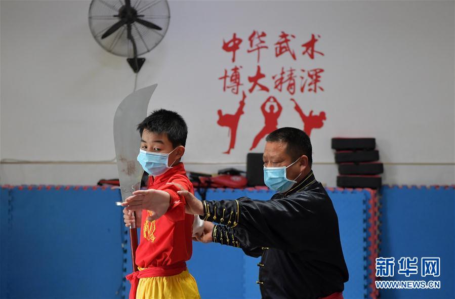 4月21日,袁建林(右)正在指导孩子练习武术。 目前,受新冠肺炎疫情影响,江西省宜春市各中小学校还未全面开学,不少孩子仍居家学习。在宜春市袁州区南庙镇,南庙武术的传承人袁建林利用业余时间,为村里的孩子免费教授传统武术,让孩子们在学习之余锻炼身体,强健体魄。 新华社记者 彭昭之 摄