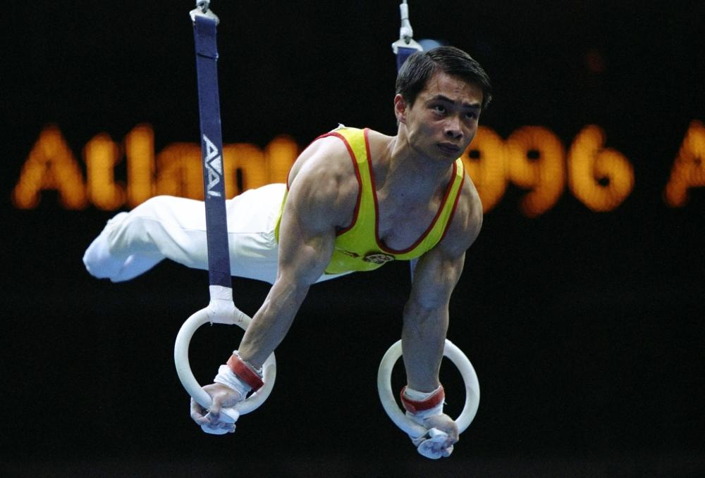 央视网消息:1996年7月24日,亚特兰大,中国运动员李小双在吊环比赛中。