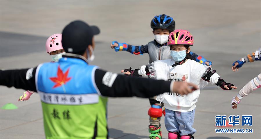 4月29日,儿童们在本溪市枫叶广场跟随教练学习轮滑。 近日,辽宁省本溪市天气渐暖,儿童们在家长的陪伴下来到户外嬉戏健身,享受春光。 新华社记者姚剑锋摄