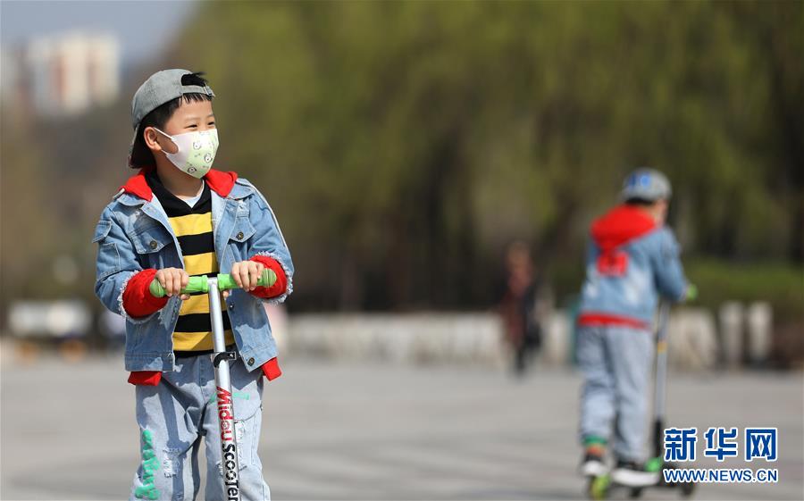 4月29日,两名儿童在本溪市枫叶广场滑滑板车。 近日,辽宁省本溪市天气渐暖,儿童们在家长的陪伴下来到户外嬉戏健身,享受春光。 新华社记者姚剑锋摄