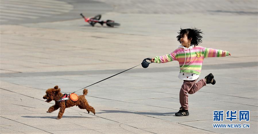 4月29日,一名儿童在本溪市枫叶广场牵着宠物狗奔跑。 近日,辽宁省本溪市天气渐暖,儿童们在家长的陪伴下来到户外嬉戏健身,享受春光。 新华社记者姚剑锋摄