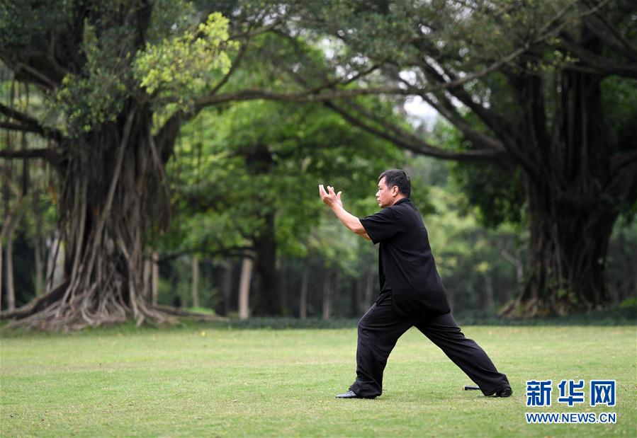 4月30日,在广西南宁南湖边,市民晨练健身。 广西南宁南湖边绿树成荫,每天早上都有大批市民来这里晨练健身。 新华社记者 陆波岸 摄
