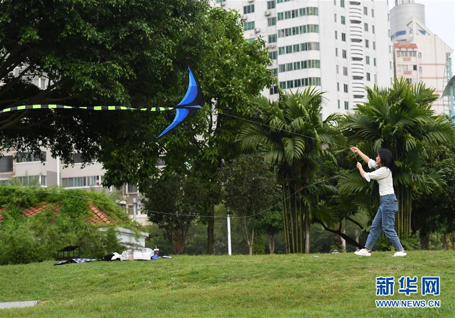 4月29日,在广西南宁南湖边,一位市民在放风筝。 当日,广西南宁晴空万里,市民纷纷走出户外,健身休闲,享受春光。 新华社记者 陆波岸 摄