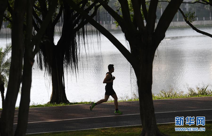 4月29日,在广西南宁南湖边,一位市民跑步健身。 当日,广西南宁晴空万里,市民纷纷走出户外,健身休闲,享受春光。 新华社记者 陆波岸 摄