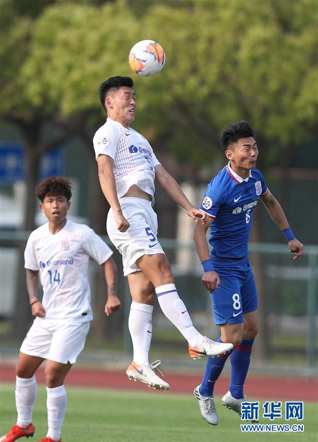 5月4日,上海绿地申花白队球员朱辰杰(中)在比赛中争顶。 当日,2020“三菱重工”绿地申花蓝白争霸赛的首场比赛在上海开赛,蓝队与白队以1比1的比分战平。据悉,绿地申花蓝白争霸赛剩余两场比赛将分别于5月12日、17日进行。 新华社记者丁汀摄
