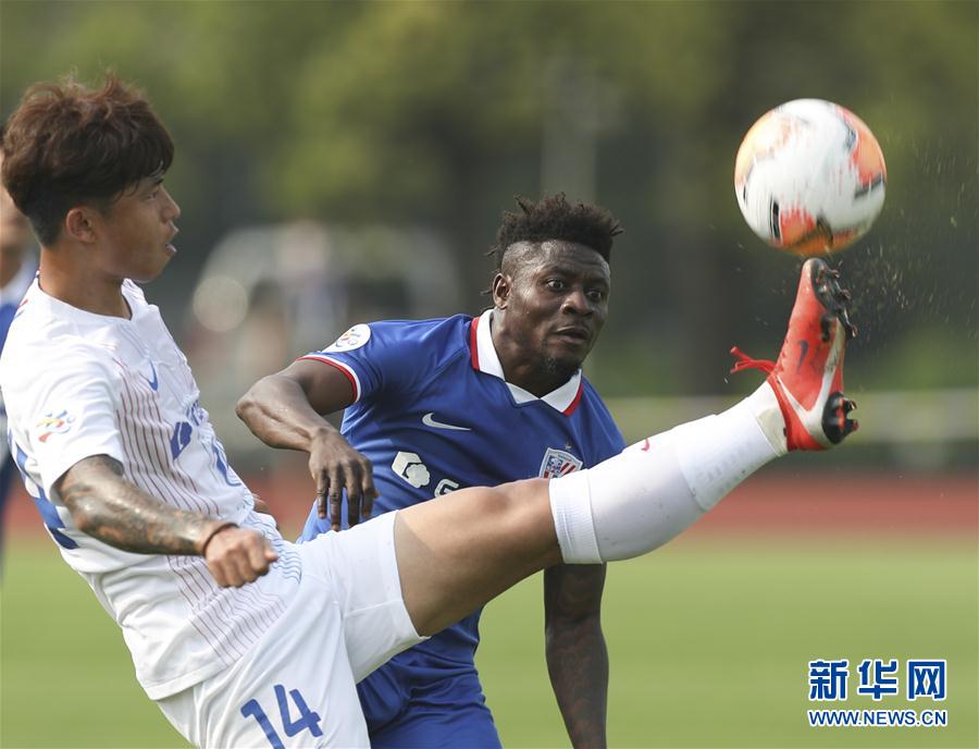 5月4日,上海绿地申花白队球员孙凯(左)与蓝队球员马丁斯在比赛中拼抢。 当日,2020“三菱重工”绿地申花蓝白争霸赛的首场比赛在上海开赛,蓝队与白队以1比1的比分战平。据悉,绿地申花蓝白争霸赛剩余两场比赛将分别于5月12日、17日进行。 新华社记者丁汀摄