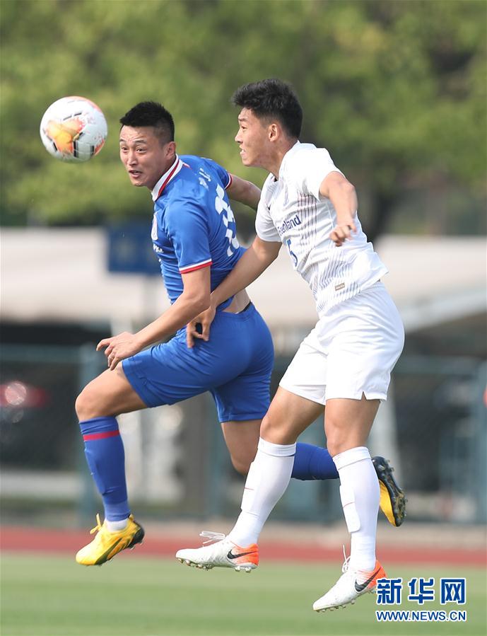 5月4日,上海绿地申花蓝队球员朱建荣(左)与白队球员朱辰杰与在比赛中争顶。 当日,2020“三菱重工”绿地申花蓝白争霸赛的首场比赛在上海开赛,蓝队与白队以1比1的比分战平。据悉,绿地申花蓝白争霸赛剩余两场比赛将分别于5月12日、17日进行。 新华社记者丁汀摄