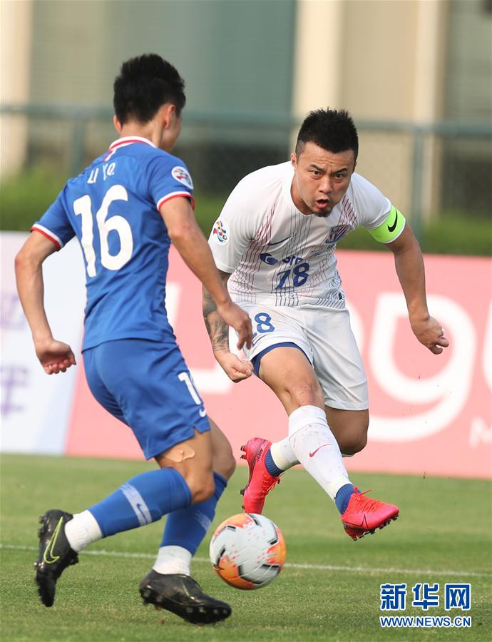 5月4日,上海绿地申花白队球员曹赟定(右)在比赛中进攻。 当日,2020“三菱重工”绿地申花蓝白争霸赛的首场比赛在上海开赛,蓝队与白队以1比1的比分战平。据悉,绿地申花蓝白争霸赛剩余两场比赛将分别于5月12日、17日进行。 新华社记者丁汀摄