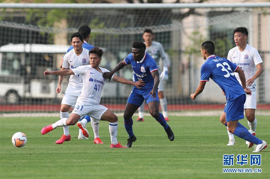 5月4日,上海绿地申花蓝队球员马丁斯(前,右三)与白队球员何龙海(前,左二)在比赛中拼抢。 当日,2020“三菱重工”绿地申花蓝白争霸赛的首场比赛在上海开赛,蓝队与白队以1比1的比分战平。据悉,绿地申花蓝白争霸赛剩余两场比赛将分别于5月12日、17日进行。 新华社记者丁汀摄