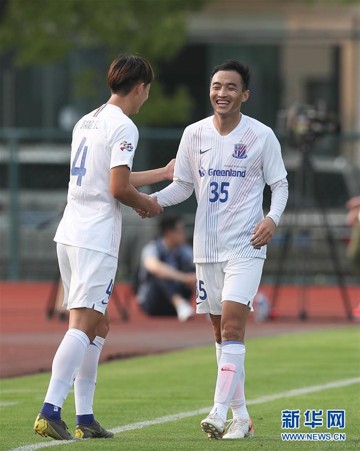5月4日,上海绿地申花白队球员冯潇霆(右)在比赛中被队友蒋圣龙替换下场。 当日,2020“三菱重工”绿地申花蓝白争霸赛的首场比赛在上海开赛,蓝队与白队以1比1的比分战平。据悉,绿地申花蓝白争霸赛剩余两场比赛将分别于5月12日、17日进行。 新华社记者丁汀摄