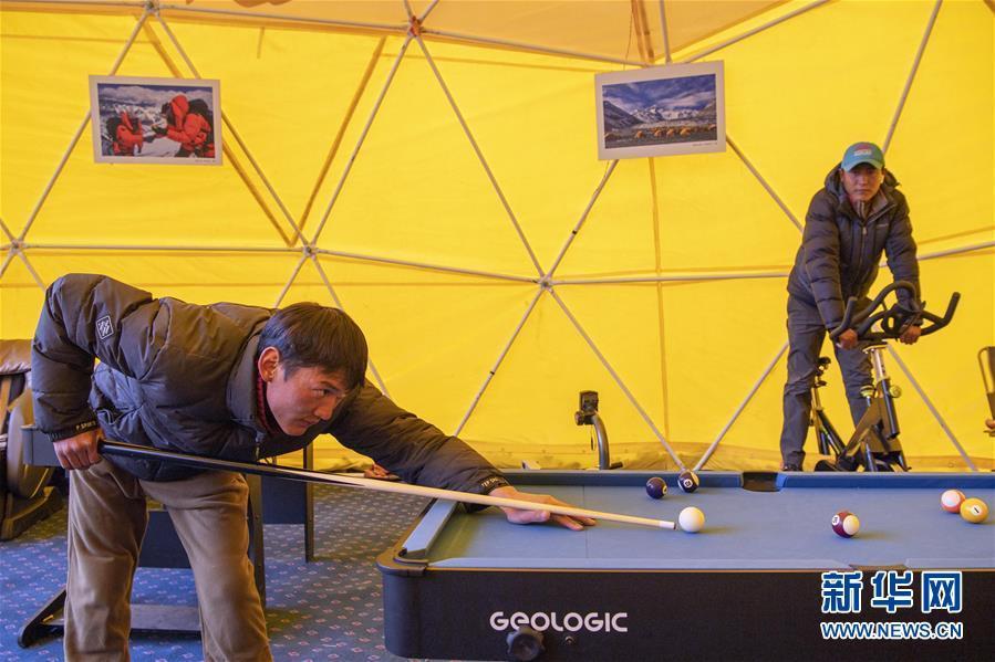 登山队员在珠峰大本营内打台球(5月1日摄)。新华社记者 孙非 摄