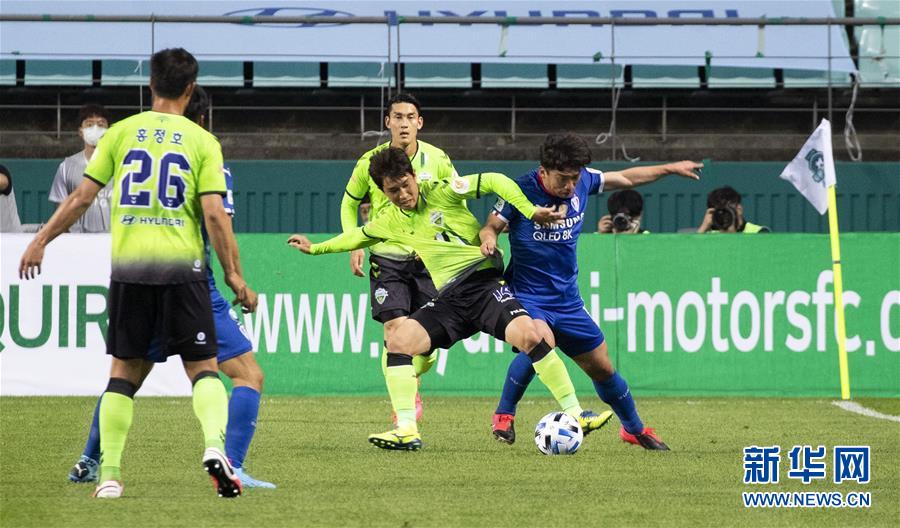 5月8日,全北现代队员李承琪和水原三星队员金民友(右一)在比赛中拼抢。 当日,受新冠肺炎疫情影响而延期揭幕的韩国K联赛2020赛季首场比赛在韩国全罗北道全州世界杯体育场举行。最终全北现代队主场以1比0胜水原三星队。 新华社发(李相浩摄)