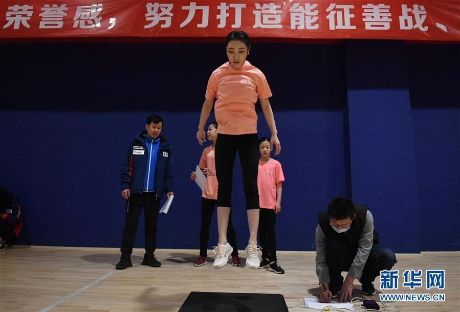5月10日,北京市冰雪运动队花样滑冰运动员王雪涵(前左)在测试垂直纵跳。 当日,北京市冰雪运动队进行体能测试,本次体能测试由基础体能、躯干稳定性和上下肢左右侧力量均衡性、板块体能三组构成,队员们在测试中进行短跑、纵跳、深蹲、卧推等项目考核。 新华社记者张晨霖摄
