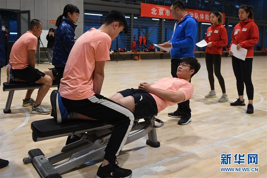 5月10日,北京市冰雪运动队冰壶运动员张岩松(前右)在测试腹肌耐力。 当日,北京市冰雪运动队进行体能测试,本次体能测试由基础体能、躯干稳定性和上下肢左右侧力量均衡性、板块体能三组构成,队员们在测试中进行短跑、纵跳、深蹲、卧推等项目考核。 新华社记者张晨霖摄