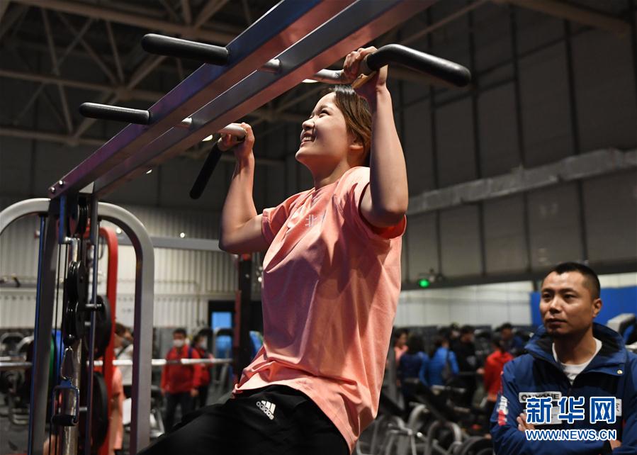 5月10日,北京市冰雪运动队速度滑冰运动员马海倩(左)在测试引体向上。 当日,北京市冰雪运动队进行体能测试,本次体能测试由基础体能、躯干稳定性和上下肢左右侧力量均衡性、板块体能三组构成,队员们在测试中进行短跑、纵跳、深蹲、卧推等项目考核。 新华社记者张晨霖摄