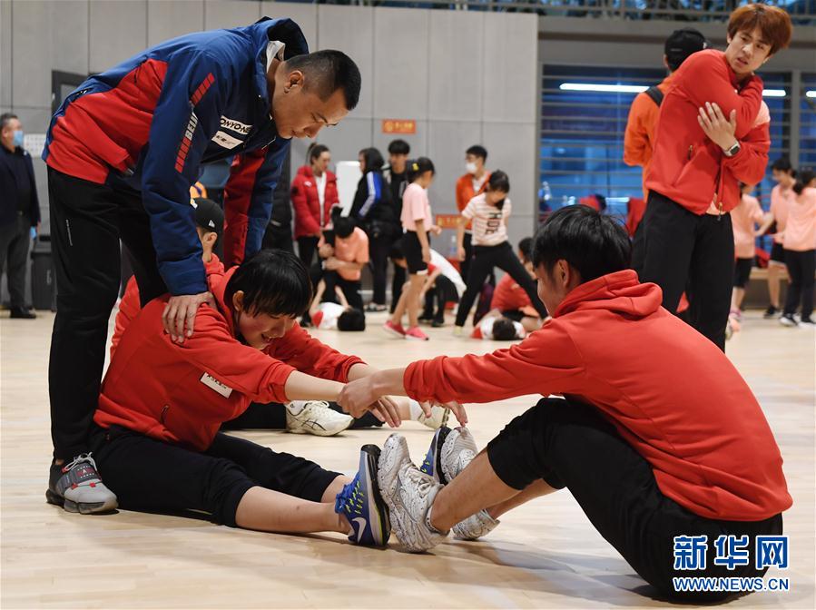 5月10日,北京市冰雪运动队速度滑冰运动员孙小涵(左二)在测试前做准备活动。 当日,北京市冰雪运动队进行体能测试,本次体能测试由基础体能、躯干稳定性和上下肢左右侧力量均衡性、板块体能三组构成,队员们在测试中进行短跑、纵跳、深蹲、卧推等项目考核。 新华社记者张晨霖摄
