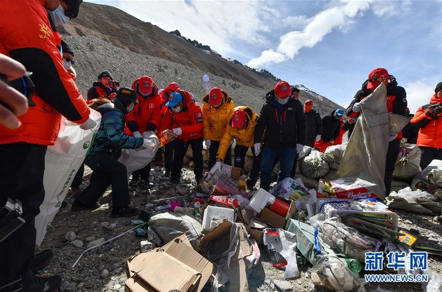 5月11日,参加2020年春季登山垃圾清理回收活动的人员将捡拾来的垃圾装袋,准备运往山下。 当日,2020年春季登山垃圾清理回收活动在海拔5200米的珠峰登山大本营举行。珠穆朗玛峰、卓奥友峰、希夏邦马峰三座山峰清理的垃圾将按分类回收,交给山峰所在地环保部门处理;部分可回收登山垃圾将回收处理。 此次活动由西藏自治区体育局和中国登山协会主办。西藏自治区体育局局长尼玛次仁表示,三座山峰的垃圾清理工作于4月20日启动,西藏自治区登山队、登山协会、西藏圣山公司、西藏拉萨喜马拉雅登山向导学校承担清理工作。目前,卓奥友峰、希夏邦马峰登山垃圾清理活动已完成,珠穆朗玛峰清理登山垃圾活动将持续至6月。 新华社记者 晋美多吉 摄