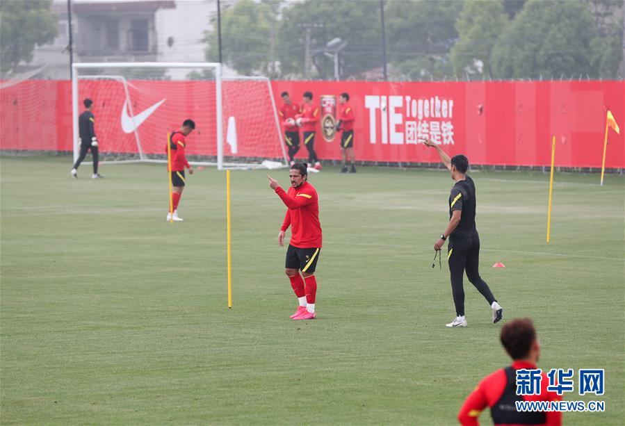 5月11日,国足球员洛国富(中)在训练中。新华社记者 丁汀 摄