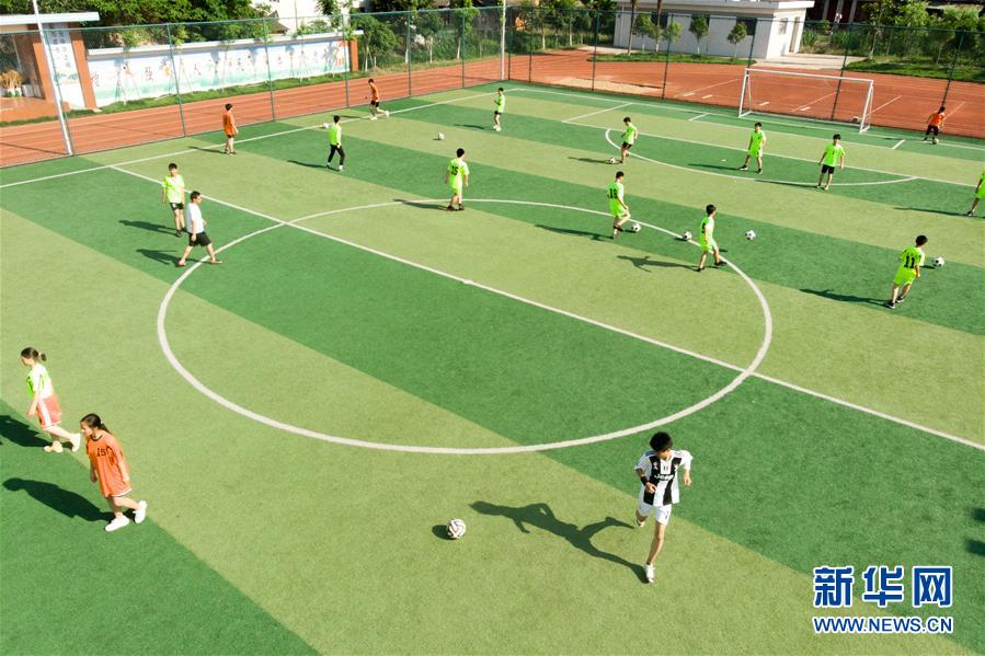 5月12日,学生们在体育课上进行足球训练。(无人机拍摄)。 湖南省安乡县陈家嘴镇芦林铺中学是“全国青少年校园足球特色学校”。自4月13日开学以来,学校在做好疫情防控措施的同时,以12支班级足球队为单位,利用体育课、大课间等时间组织学生进行足球训练,以丰富学生校园生活,提高校园足球运动水平。 新华社发(陈思汗摄)
