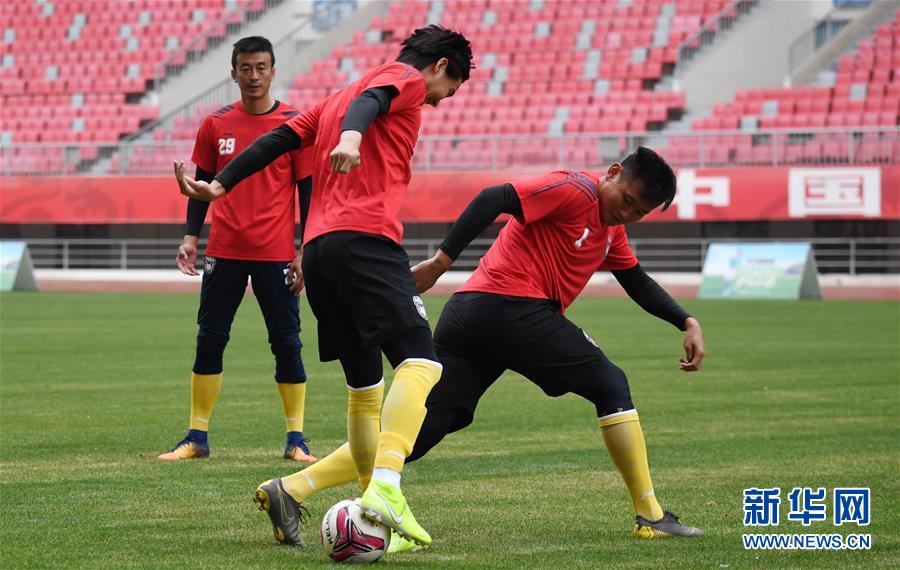 5月13日,陕西大秦之水队门将王琦(右)在公开训练课上。 当日,中甲陕西大秦之水队在陕西省渭南市体育中心体育场举行公开训练课,全队在做好疫情防控工作的前提下在主场恢复训练,备战中甲联赛。 新华社记者:李一博摄