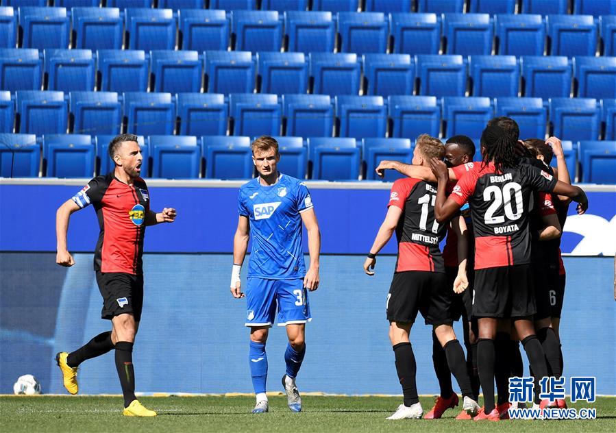 5月16日,柏林赫塔队球员庆祝进球。 当日,受新冠肺炎疫情影响而停赛的2019-2020赛季德国足球甲级联赛迎来重启,成为欧洲五大联赛中最早恢复的联赛。在重启后的首轮比赛中,柏林赫塔队客场以3比0战胜霍芬海姆队。 新华社/路透