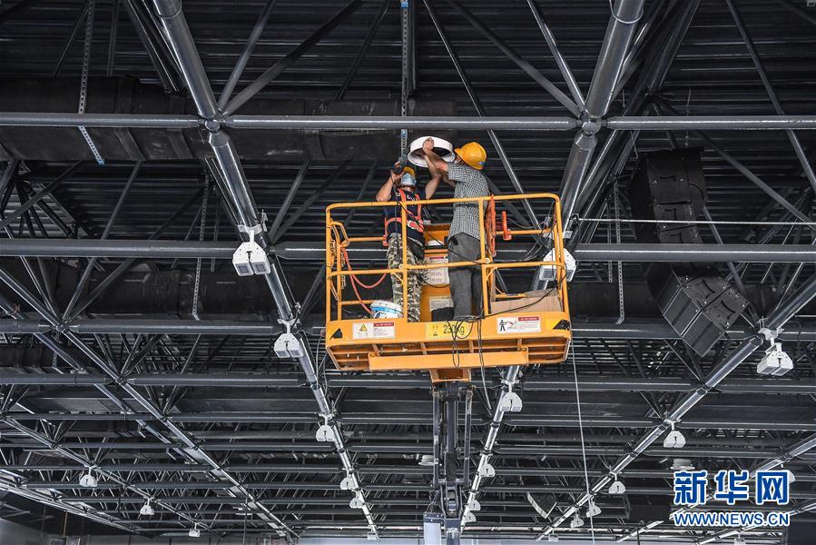 5月17日,工人在海口观澜湖足球基地配套楼栋内施工。 据了解,海口观澜湖足球基地计划建设30片国际标准化足球训练场以及相关配套设施,目前,部分室外足球场已完工并投入使用,球员公寓、更衣室、室内足球馆等配套设施也正在加紧施工建设中。 新华社记者蒲晓旭摄