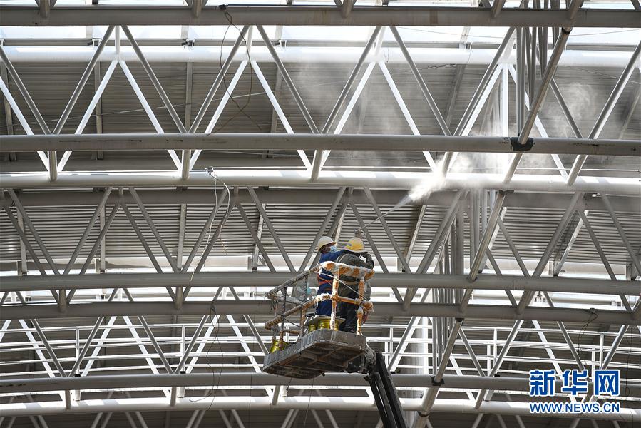 5月17日,工人在海口观澜湖足球基地室内足球馆施工。 据了解,海口观澜湖足球基地计划建设30片国际标准化足球训练场以及相关配套设施,目前,部分室外足球场已完工并投入使用,球员公寓、更衣室、室内足球馆等配套设施也正在加紧施工建设中。 新华社记者蒲晓旭摄