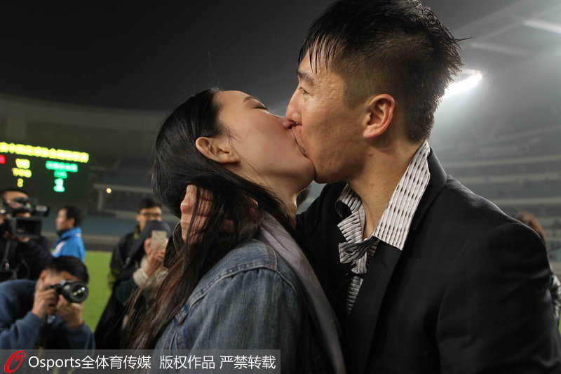2015年4月,中超联赛第4轮,江苏舜天队员任航赛后向女友求婚成功,现场亲吻女友。