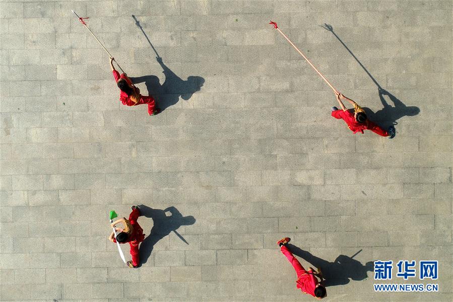 5月20日,河北省清河县几名武术爱好者在练习曦阳掌太平拳器械(无人机照片)。 曦阳掌太平拳是河北省清河县当地特色武术项目,已列入河北省省级非物质文化遗产名录。为了传统武术得到更好的传承和推广,曦阳掌太平拳传承人牛海岭利用业余时间带徒授艺,让更多群众感受传统武术魅力。 新华社记者 牟宇 摄