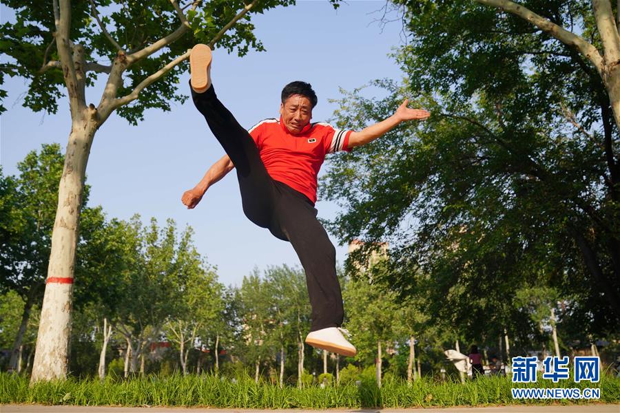 5月20日,牛海岭在示范曦阳掌太平拳动作。 曦阳掌太平拳是河北省清河县当地特色武术项目,已列入河北省省级非物质文化遗产名录。为了传统武术得到更好的传承和推广,曦阳掌太平拳传承人牛海岭利用业余时间带徒授艺,让更多群众感受传统武术魅力。 新华社记者 牟宇 摄