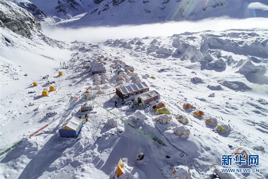 位于珠峰东绒布冰川旁海拔6500米的珠峰前进营地(5月22日摄,无人机照片)。新华社记者 晋美多吉 摄