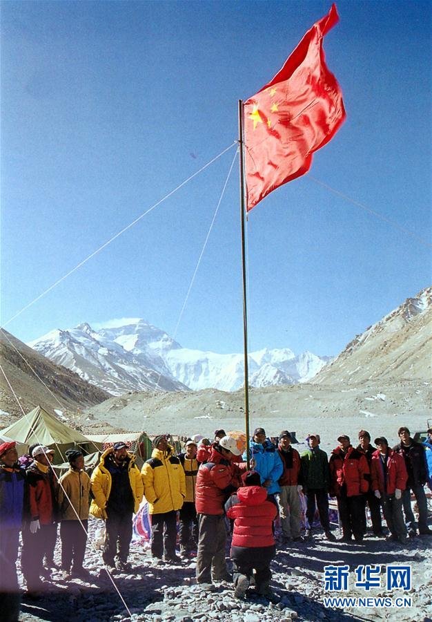 1960年5月25日,中国登山运动员王富洲、贡布、屈银华三人首次从北坡登上珠穆朗玛峰,创造了人类历史上第一次从北坡登上世界第一高峰的壮举。登山勇士们不畏险阻、一往无前的精神,鼓舞着一代代登山人向着珠穆朗玛峰前进。 这是2003年,为纪念人类登顶珠峰50周年,中国与韩国组成联合登山队,并和中国业余登山队等来自20多个国家和地区的28支队伍,600多人并肩挑战世界第一高峰。 新华社发
