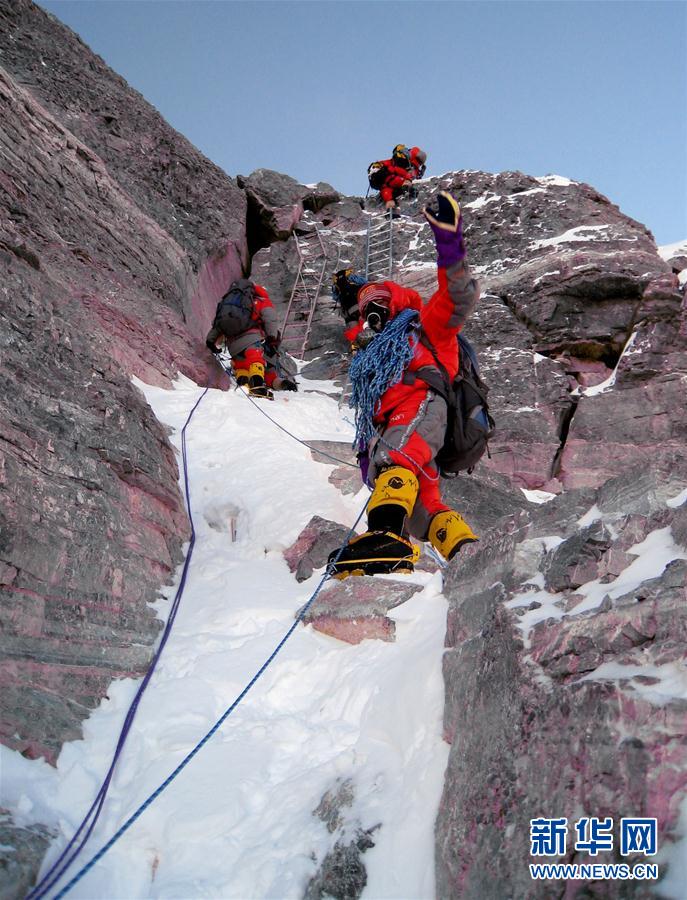 1960年5月25日,中国登山运动员王富洲、贡布、屈银华三人首次从北坡登上珠穆朗玛峰,创造了人类历史上第一次从北坡登上世界第一高峰的壮举。登山勇士们不畏险阻、一往无前的精神,鼓舞着一代代登山人向着珠穆朗玛峰前进。 这是2008年5月7日,承担珠峰海拔8300米以上修路任务的西藏登山队队员和登山学校学员在海拔8700米第二台阶处修复道路。西藏登山队的老队员开尊、拉巴、小其米及西藏登山学校的8名学员用3天时间,完成登顶道路的修建工作,为顺利登顶做出有力保障。 新华社特约记者罗布占堆摄